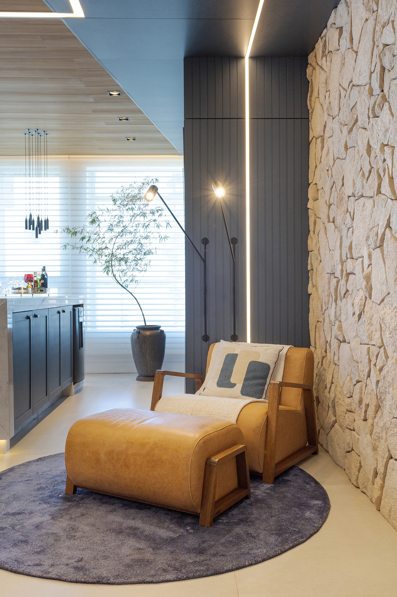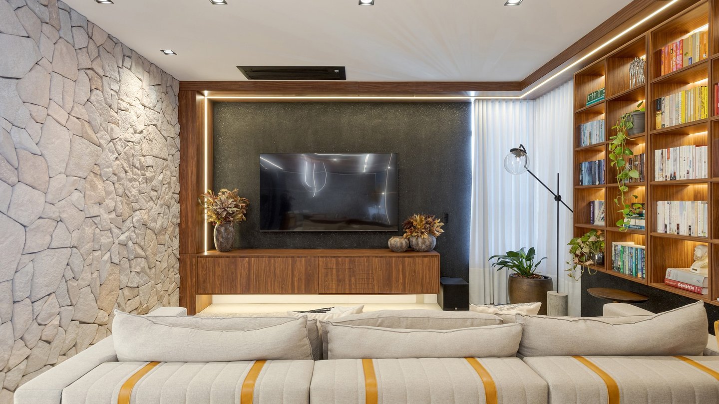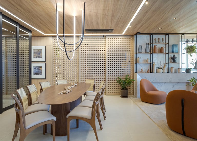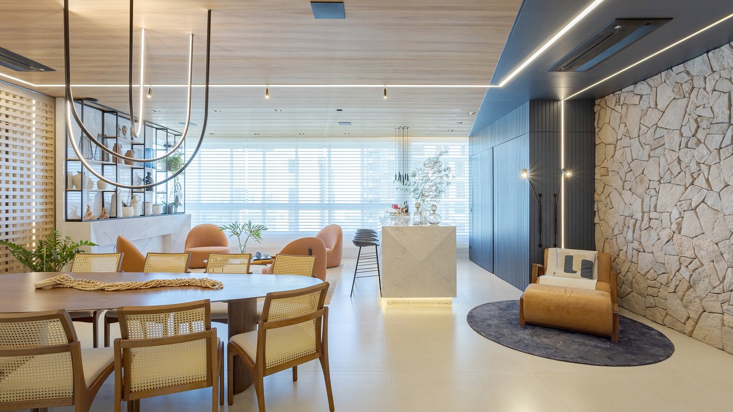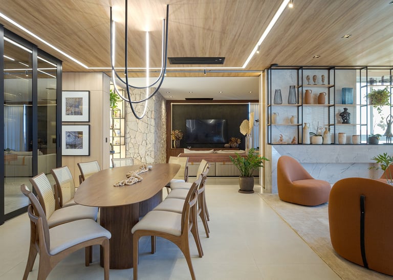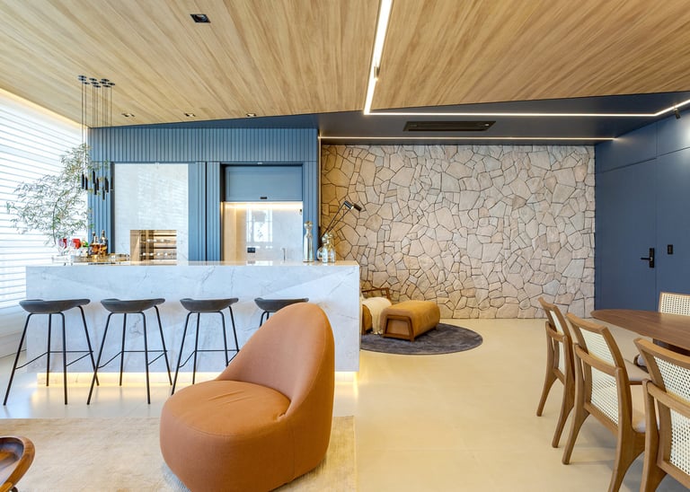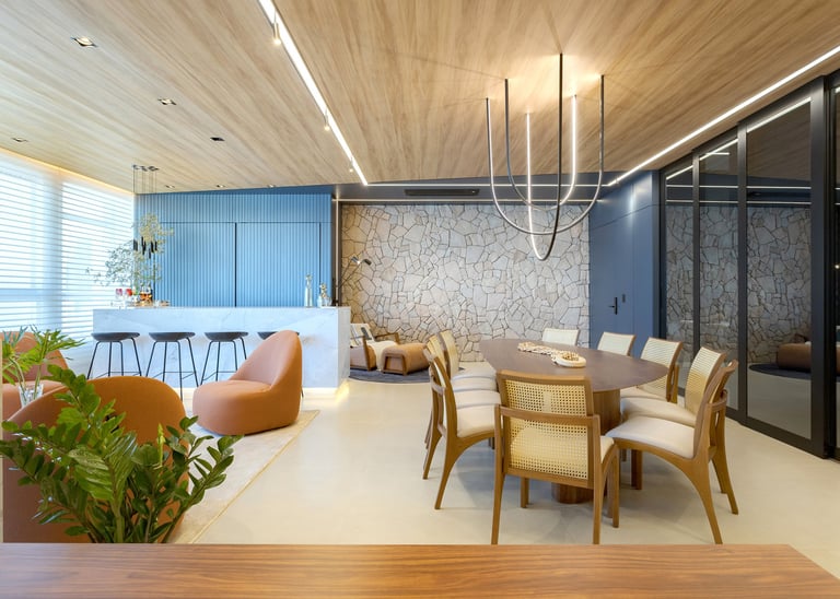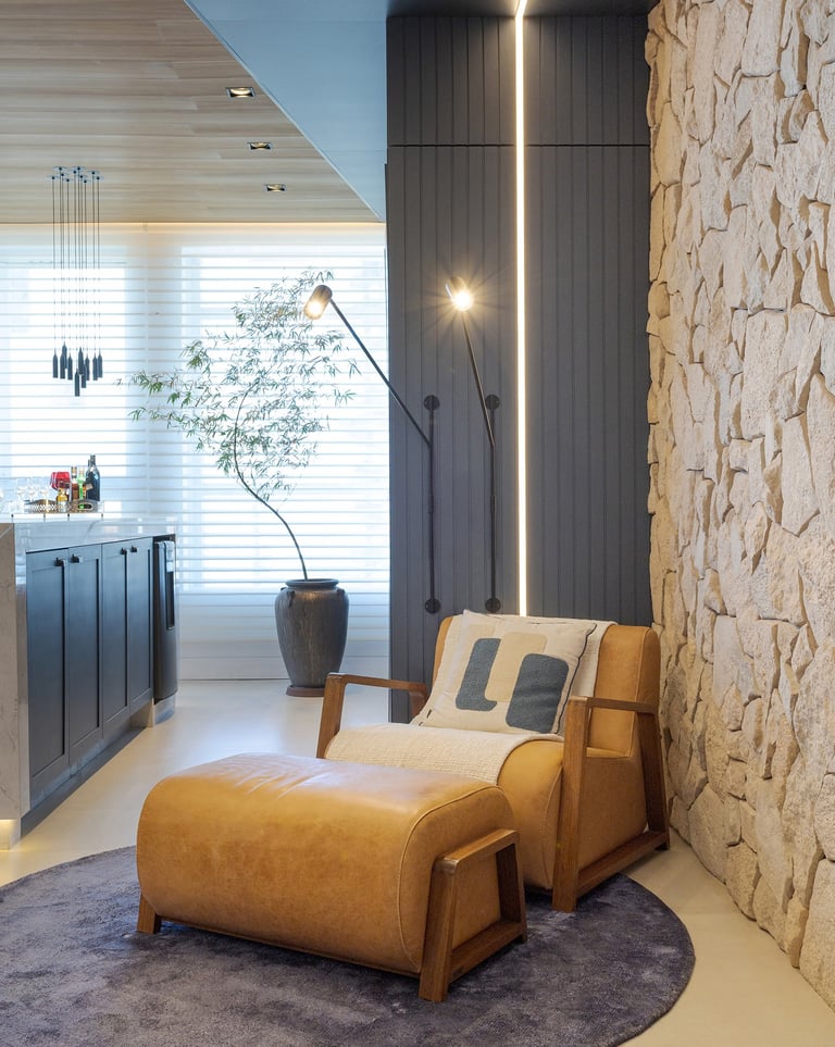 A paleta de materiais combina madeira natural, pedra, superfícies neutras e tons suaves, resultando em um ambiente elegante e atemporal. O uso da pedra natural na parede traz textura e caráter, contrastando com os painéis ripados e o forro amadeirado, que aquecem visualmente o espaço.