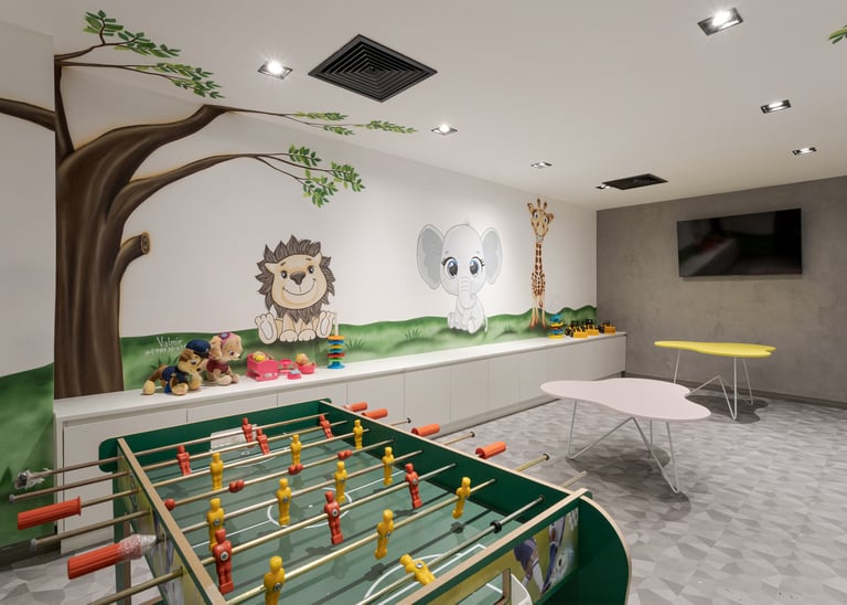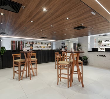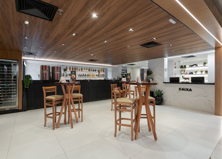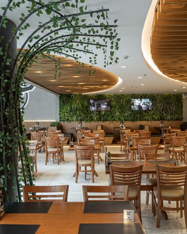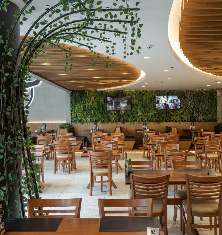 A materialidade combina madeira natural, concreto, revestimentos em tons neutros e elementos metálicos, criando um equilíbrio entre robustez e sofisticação. O forro ripado com desenho orgânico atua como elemento protagonista, integrando a iluminação linear e direcionando o olhar ao longo do espaço. A presença de vegetação, paredes verdes e elementos biofílicos suaviza a escala do ambiente e reforça a sensação de acolhimento.