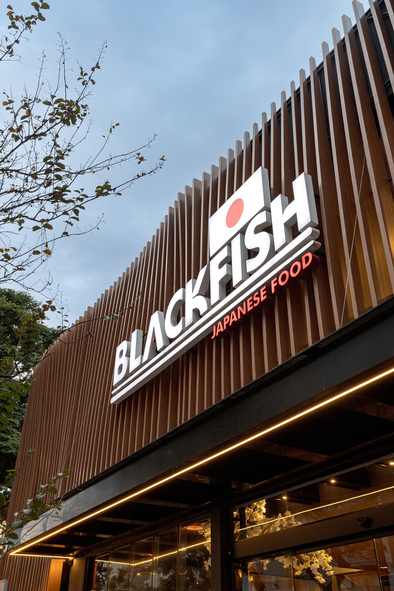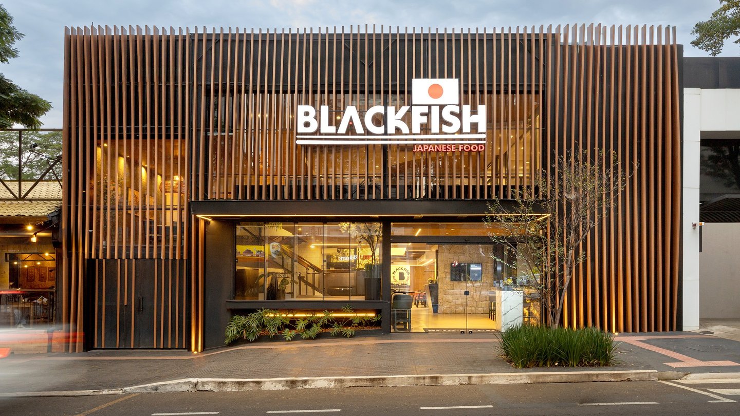 A fachada se destaca pelo uso de brises verticais em madeira, que conferem ritmo, imponência e personalidade ao edifício, além de filtrar a luz e valorizar a marca de forma marcante e elegante.