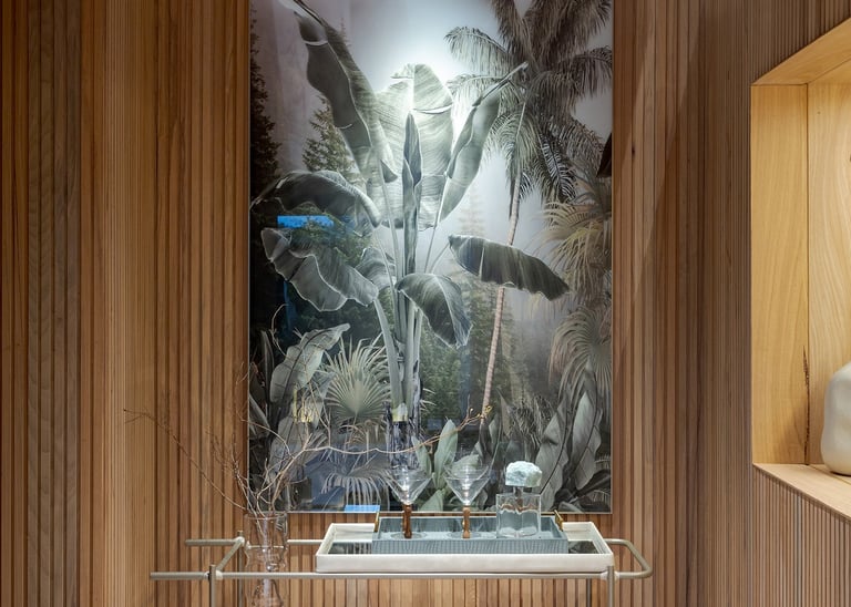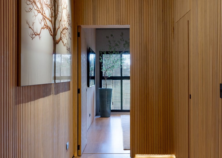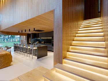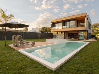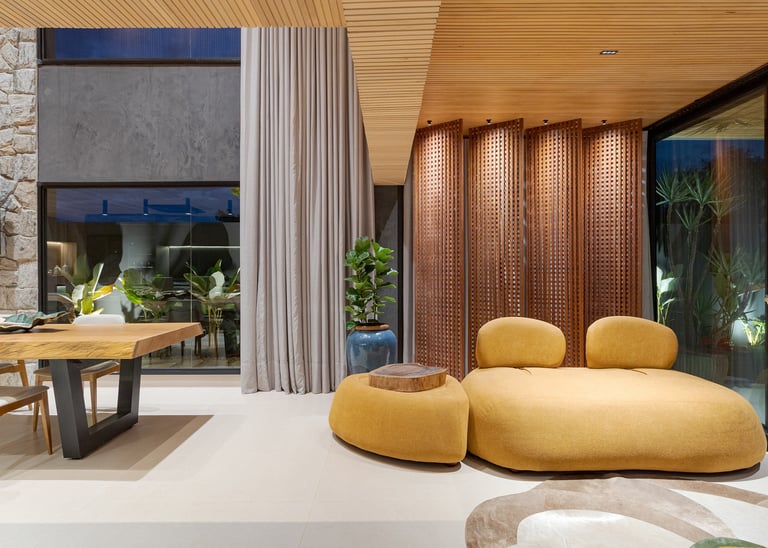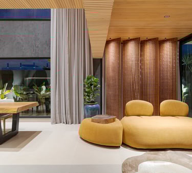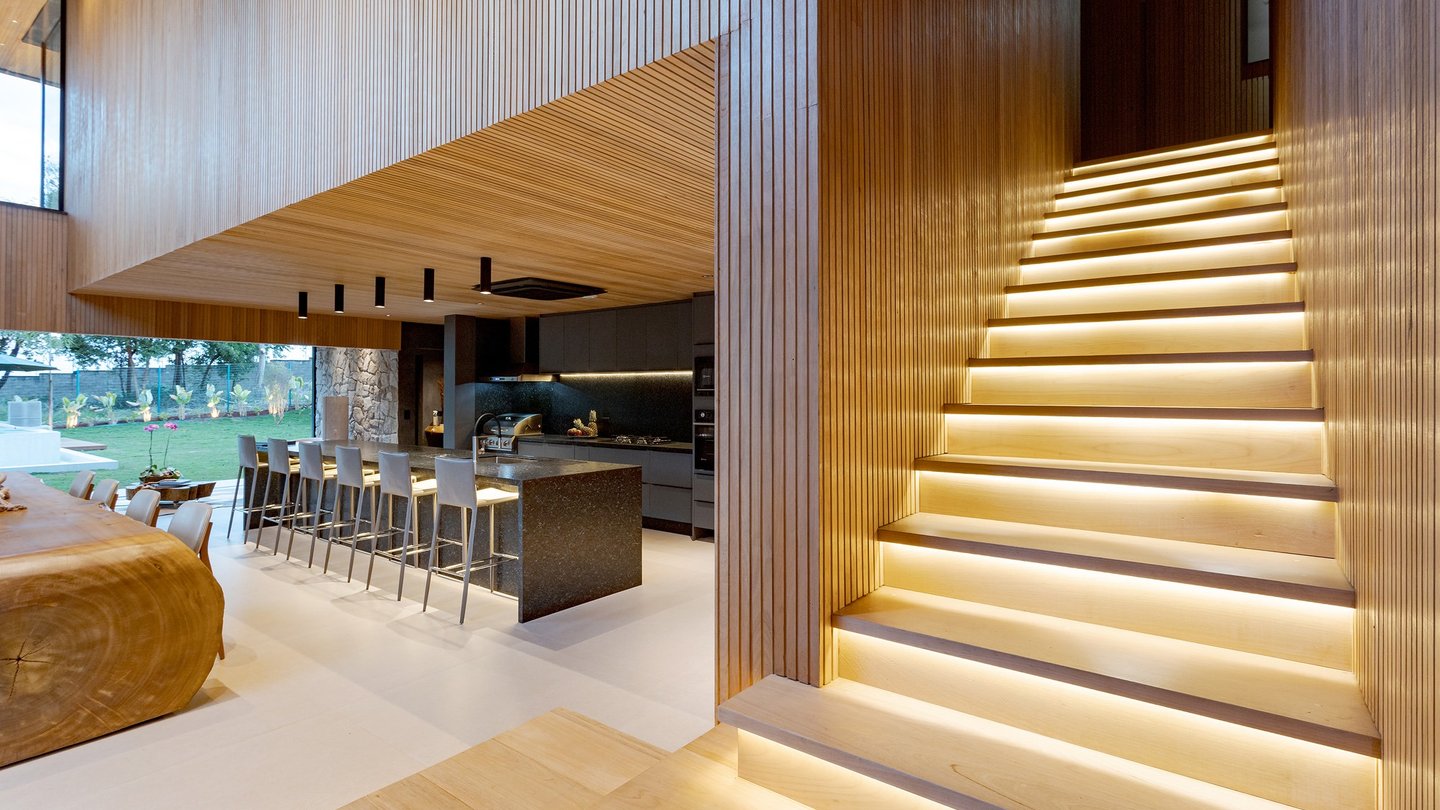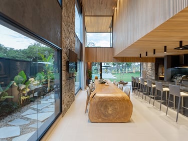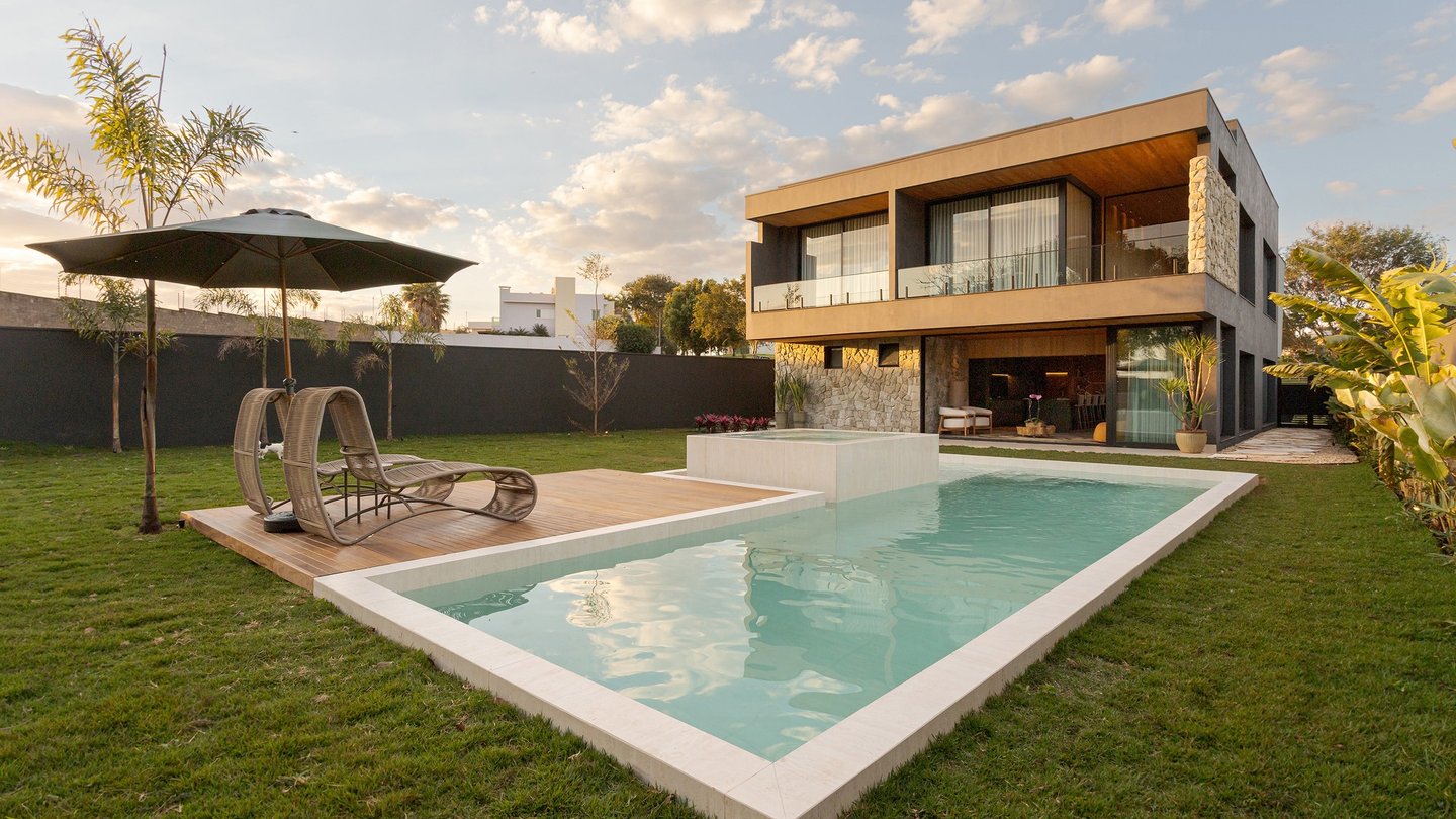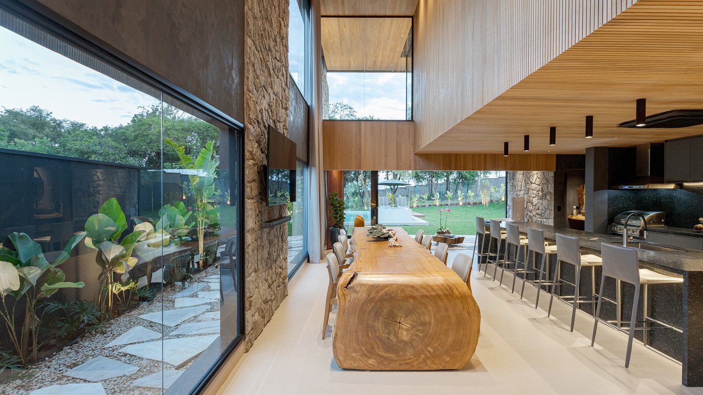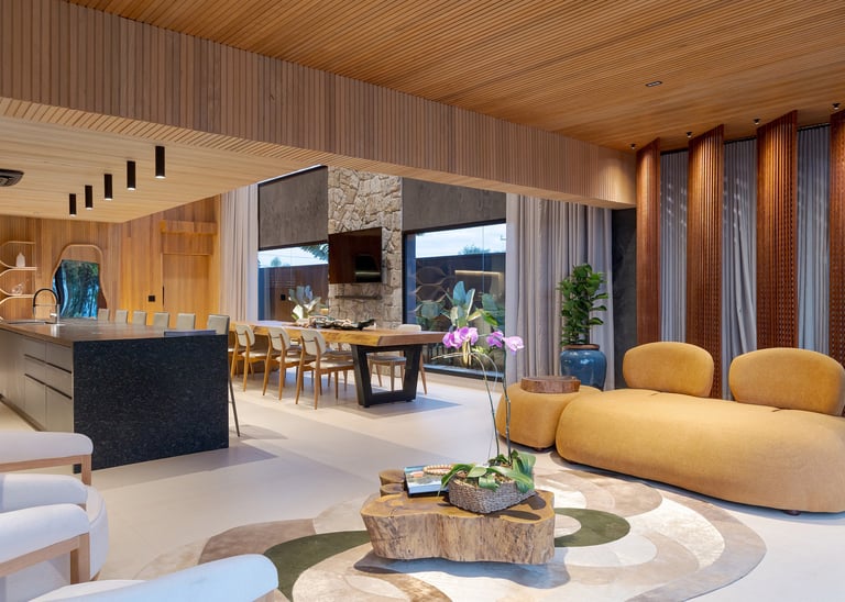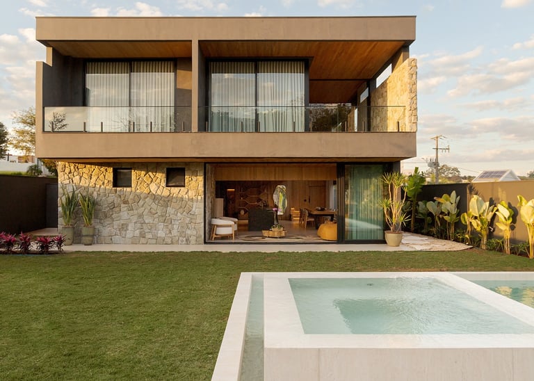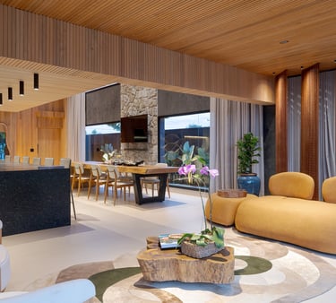 A arquitetura valoriza a integração entre interior e exterior, com grandes aberturas, planta fluida e conexão direta com o paisagismo. Os ambientes internos priorizam funcionalidade e conforto, com destaque para o uso da madeira e da iluminação indireta, que reforçam a atmosfera acolhedora e a leitura dos volumes. Na área externa, a piscina se integra ao conjunto, criando um espaço contínuo de lazer e convivência.