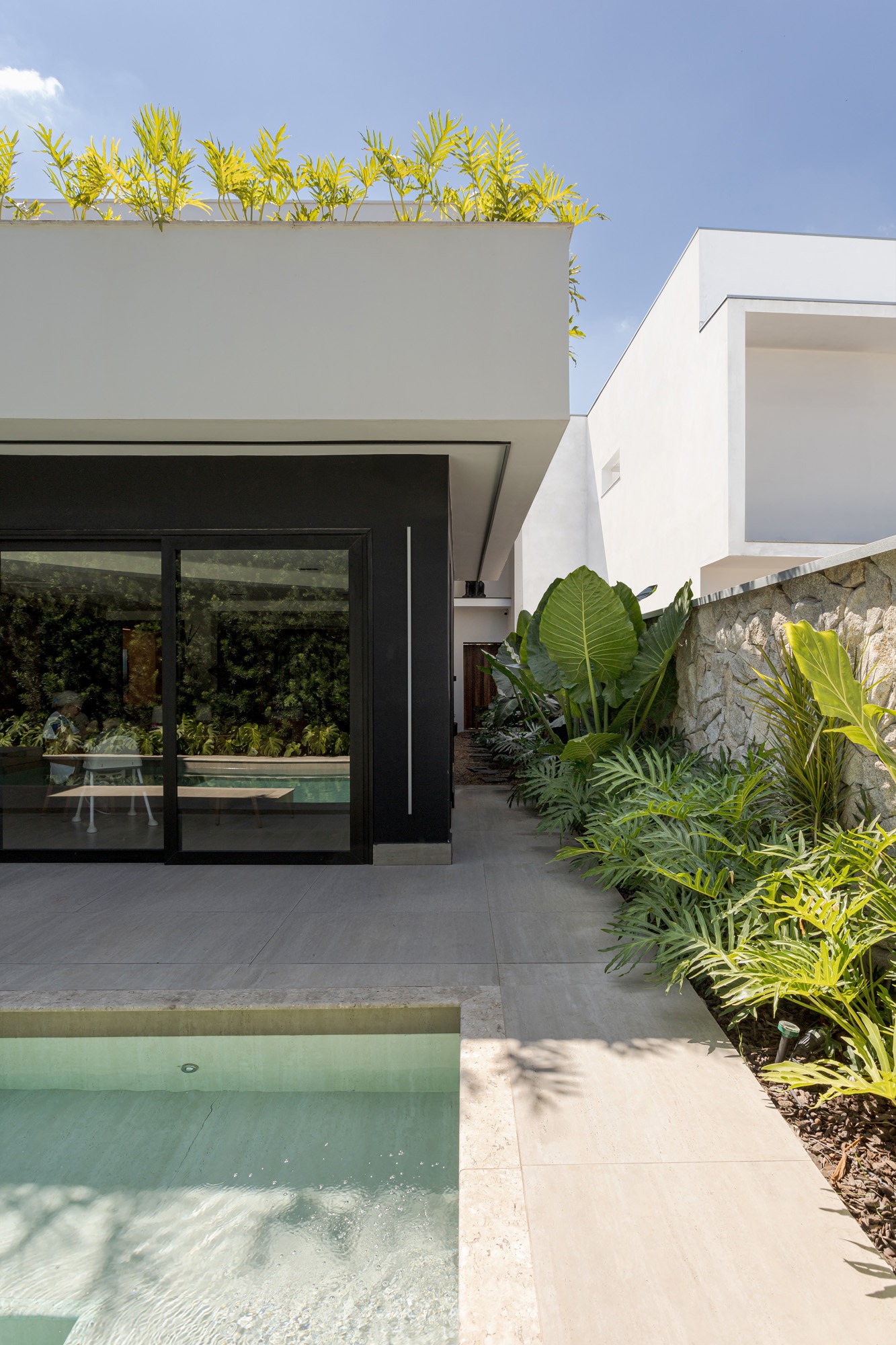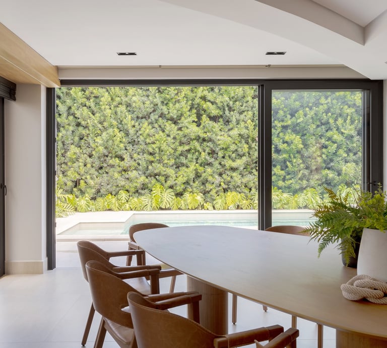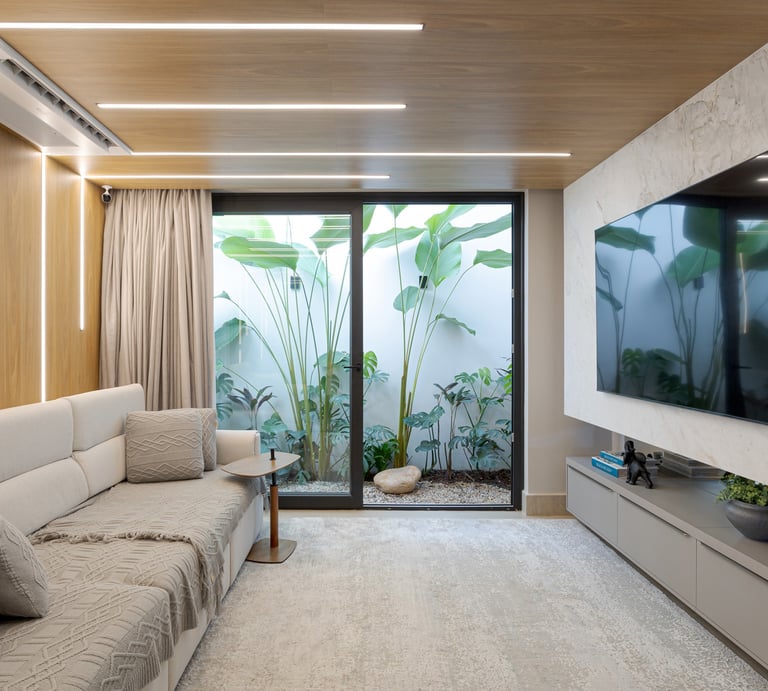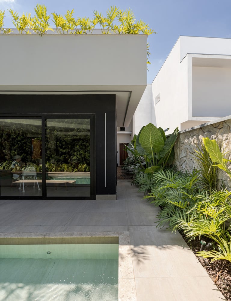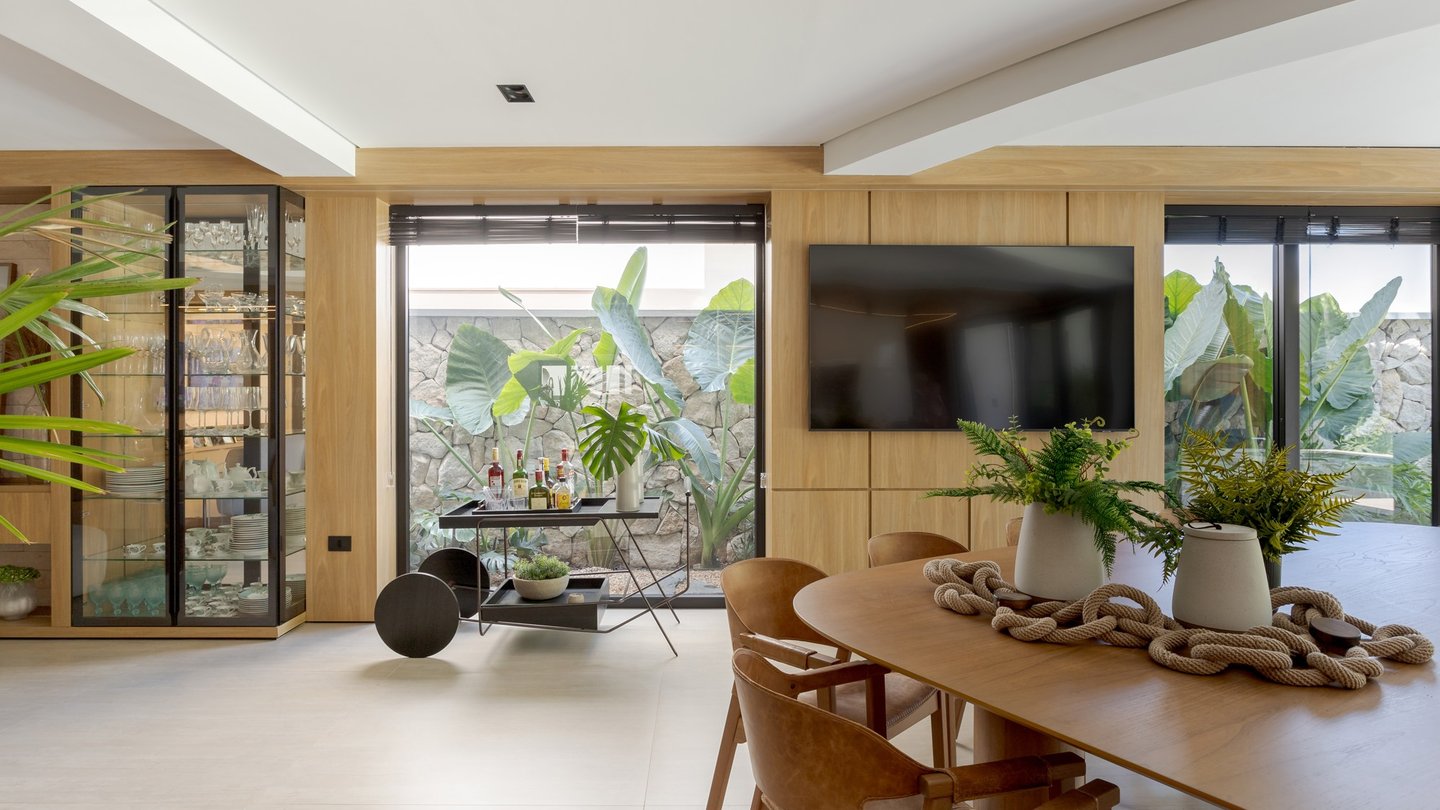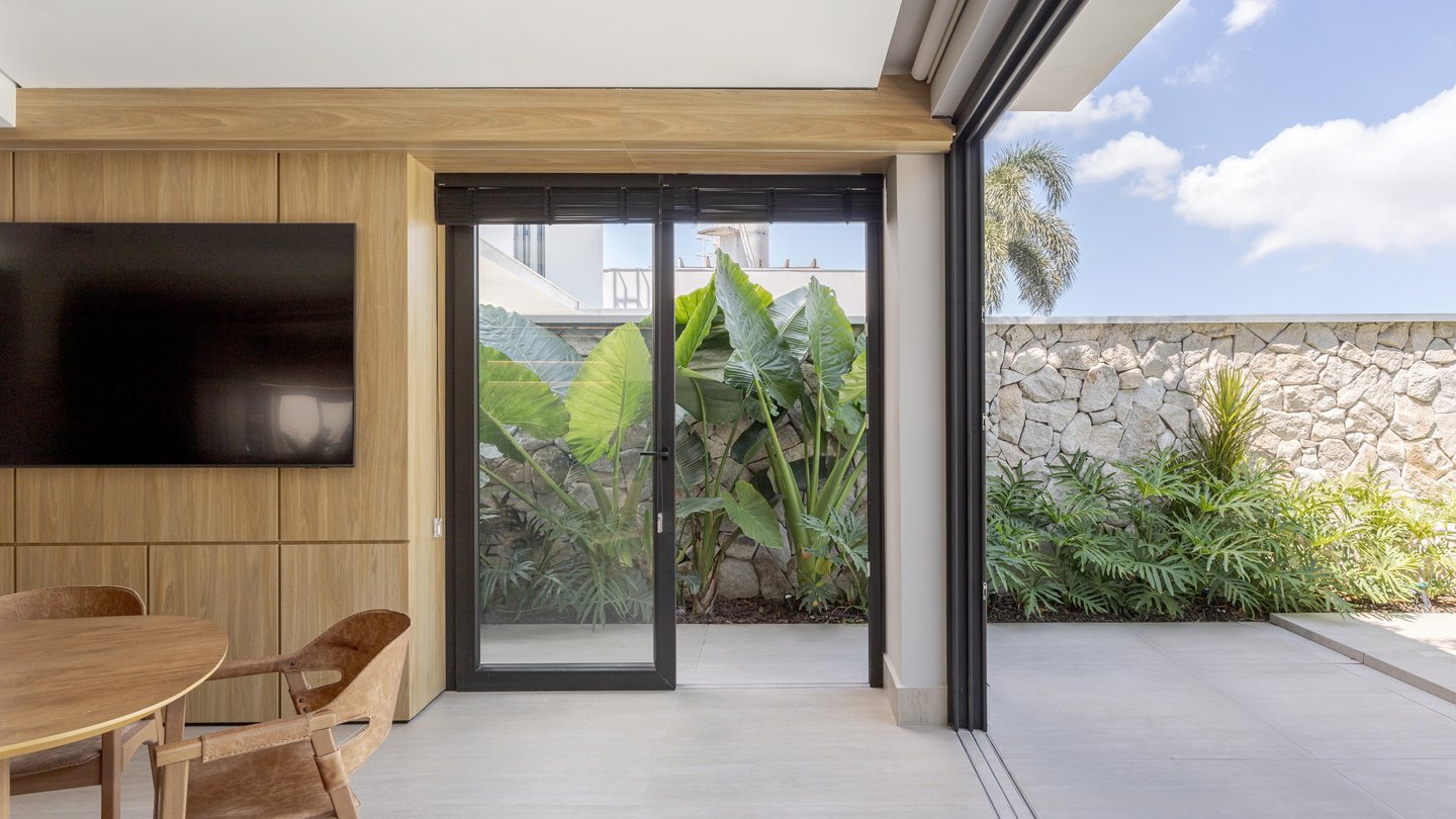 A arquitetura valoriza a integração entre interior e exterior, com grandes aberturas voltadas para o jardim e a área de lazer. Os ambientes internos apresentam planta fluida, uso predominante de madeira e acabamentos neutros, promovendo conforto visual e sensação de continuidade. O paisagismo atua como elemento fundamental do projeto, reforçando a relação da casa com o verde e qualificando os espaços de convivência.
