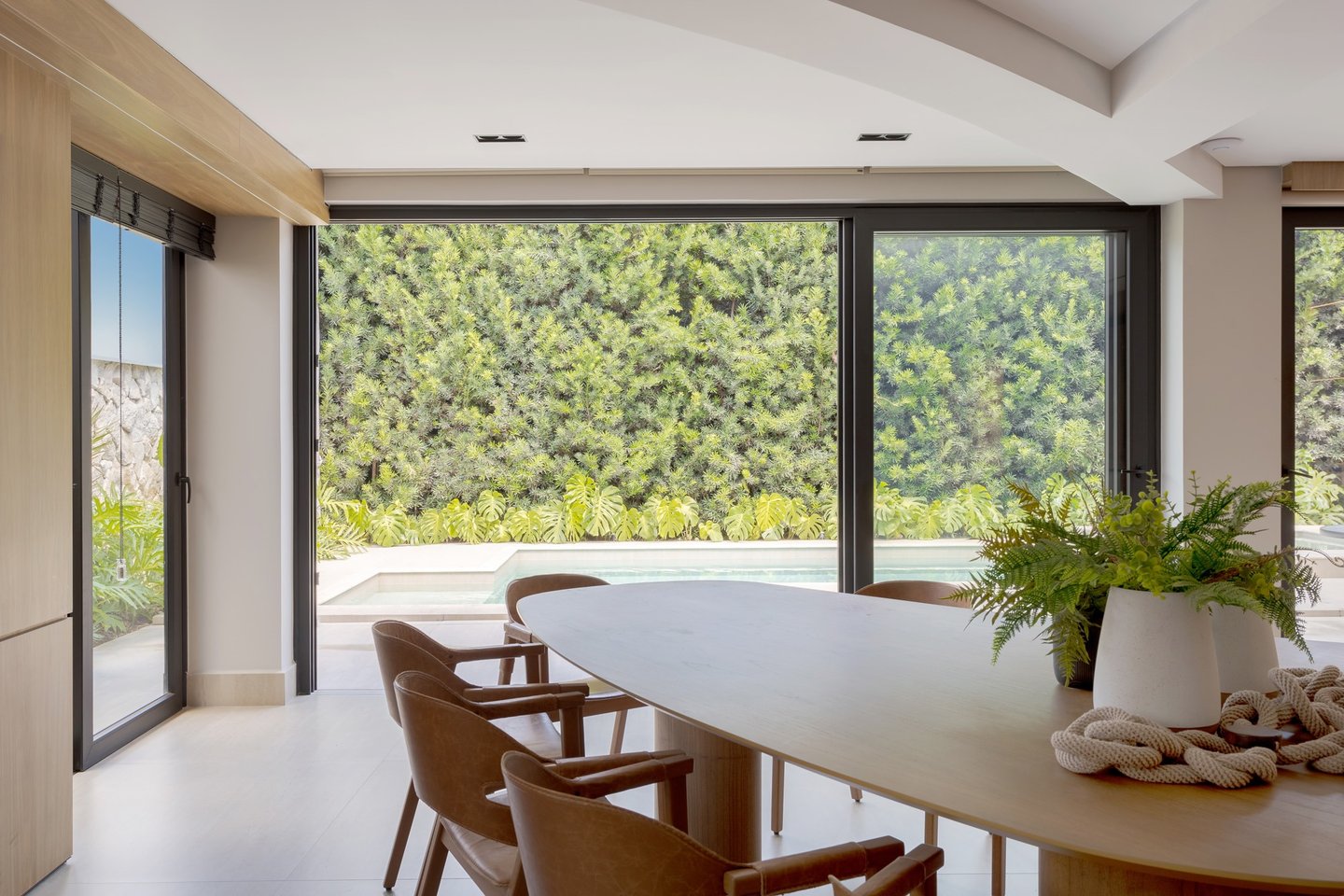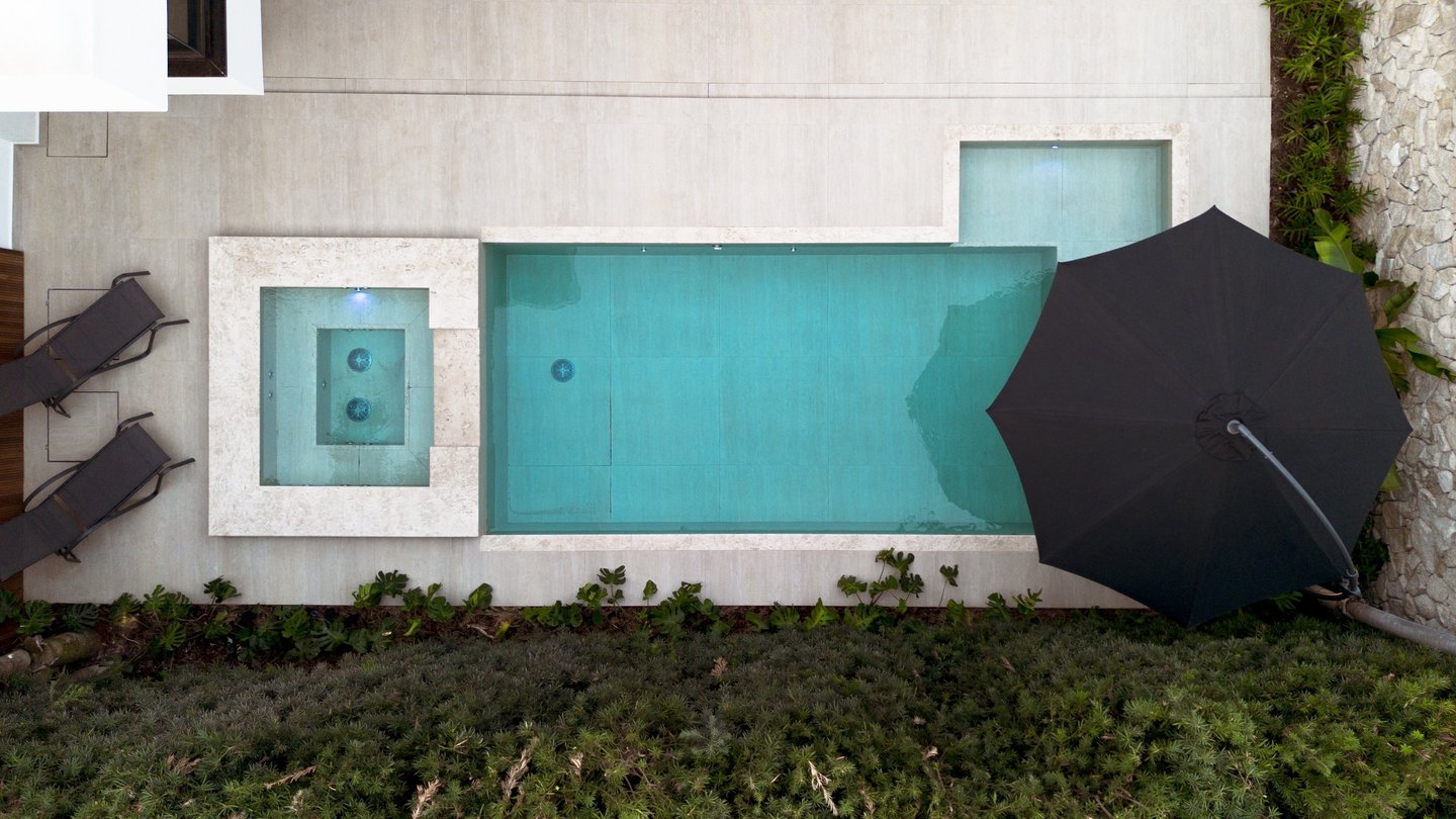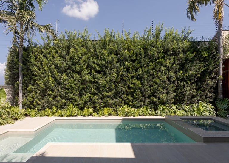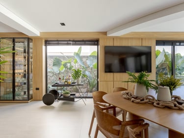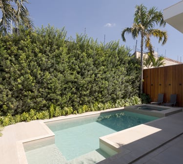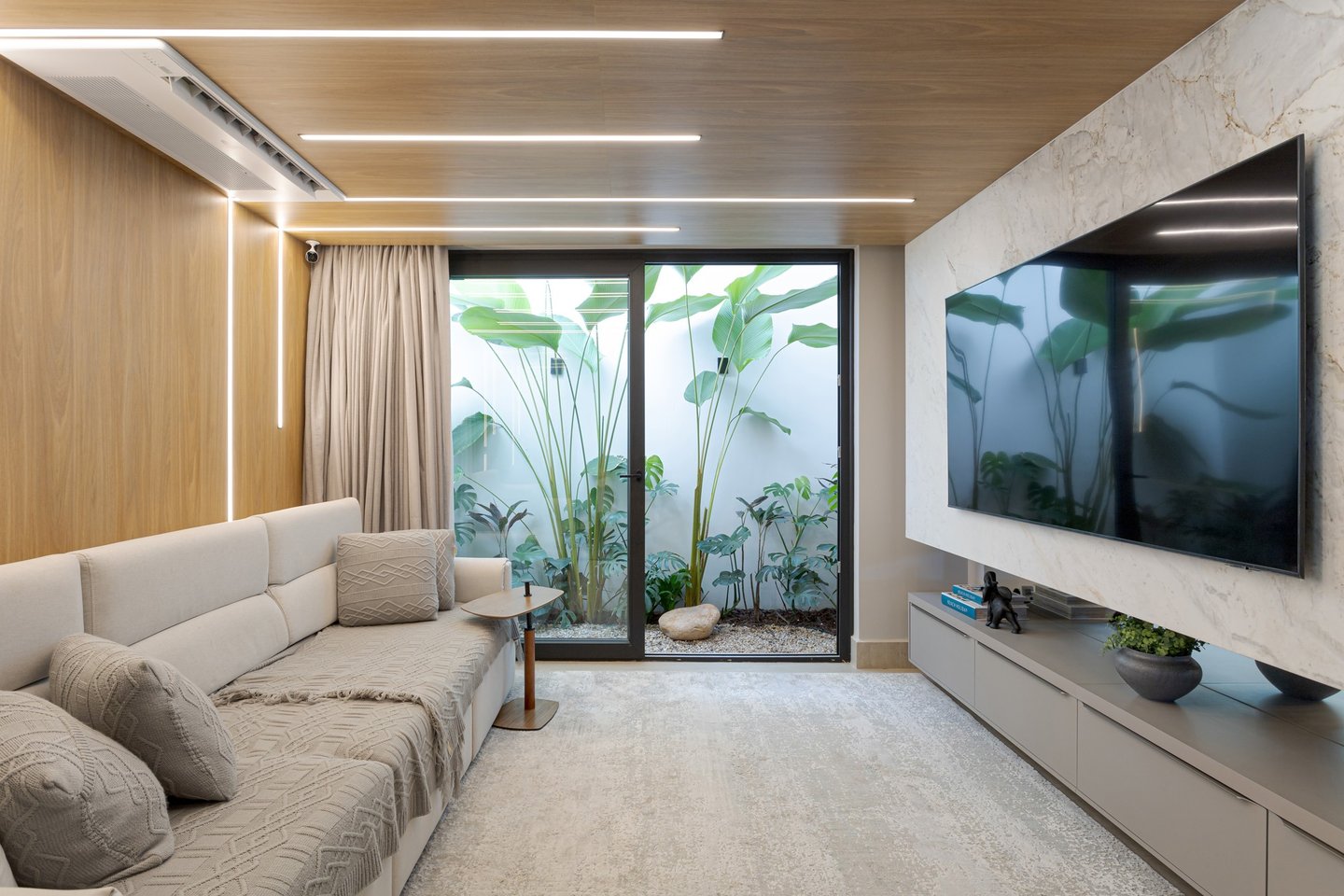 A arquitetura valoriza a integração entre interior e exterior, com grandes aberturas voltadas para o jardim e a área de lazer. Os ambientes internos apresentam planta fluida, uso predominante de madeira e acabamentos neutros, promovendo conforto visual e sensação de continuidade. O paisagismo atua como elemento fundamental do projeto, reforçando a relação da casa com o verde e qualificando os espaços de convivência.