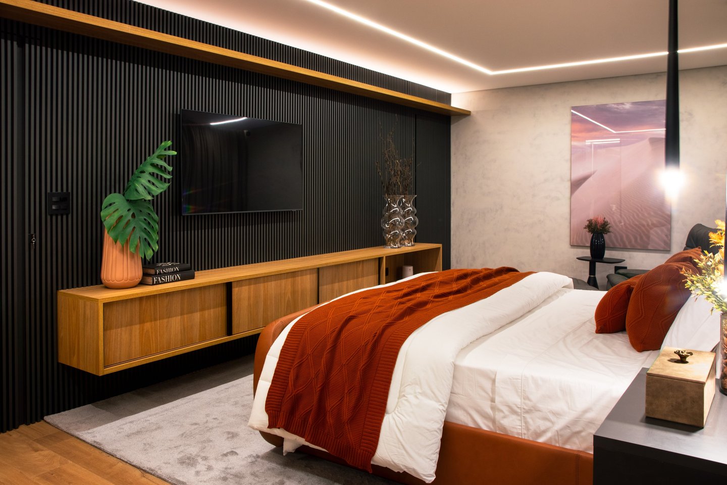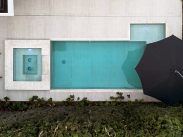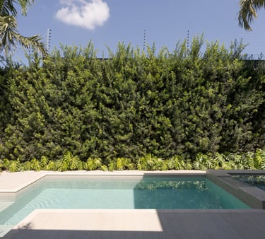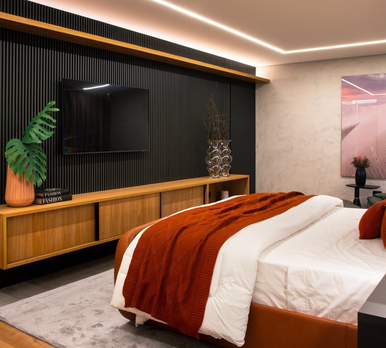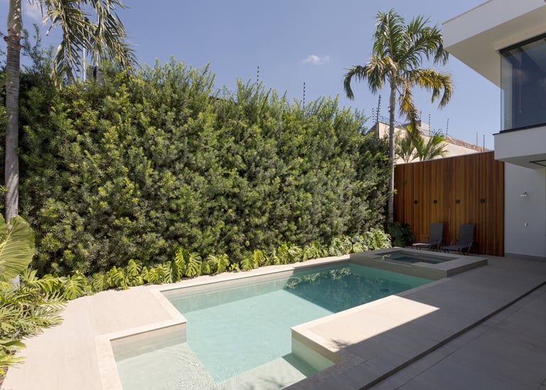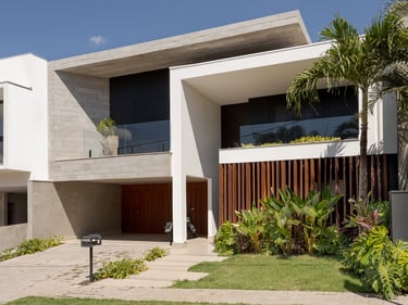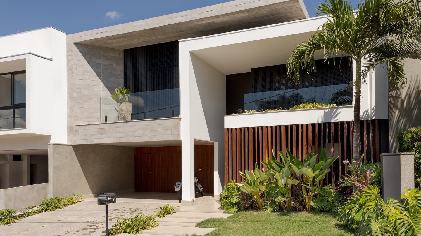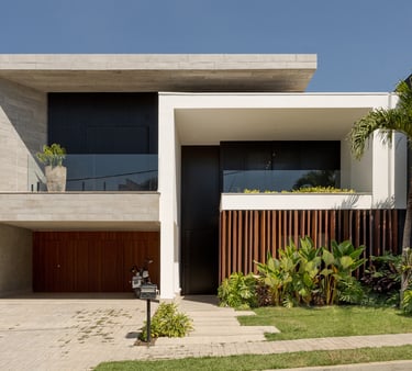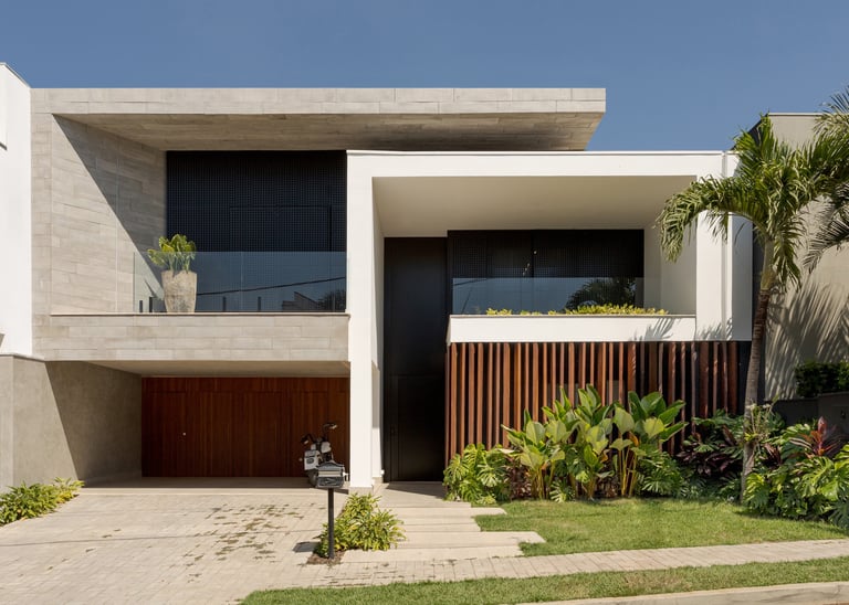 Projeto residencial contemporâneo com composição marcada por volumes sobrepostos e balanços que conferem leveza e proteção aos espaços. A fachada combina planos claros, revestimentos em pedra cimentícia e painéis ripados em madeira, criando uma leitura equilibrada entre solidez, privacidade e transparência.